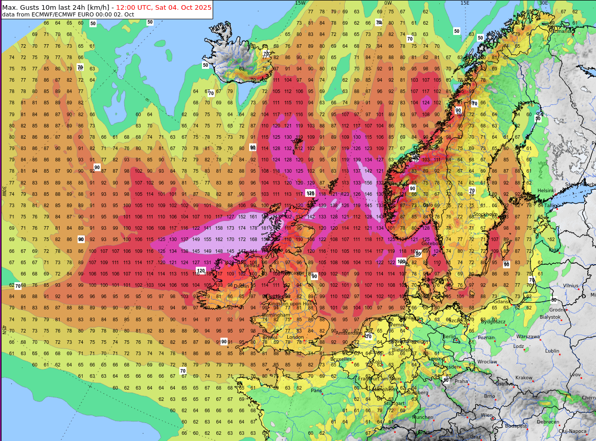 Solch eine rasche Vertiefung hat natürlich erhebliche Konsequenzen, ein Orkantief ist geborgen. Dieses wird knapp nördlich der Britischen Inseln in Richtung Nordmeer ziehen und von Irland bis zur norwegischen Küste Böen über 120 km/h bringen. Besonders heftig wird es im Norden von Irland und generell in Schottland. Hier sind sogar strichweise Böen über 150 km/h zu erwarten. Bitte die Grafik anklicken zum Vergrößern.