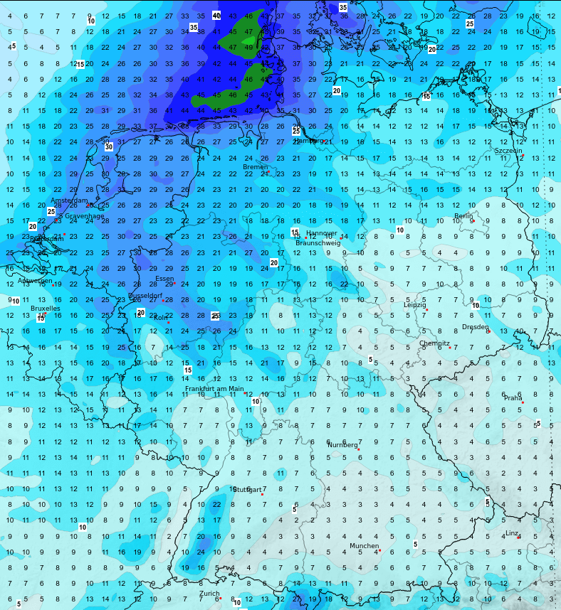 Vor allem im Norden wird es dabei zeitweise kräftig und ergiebig regnen. Auf der Rückseite der Kaltfront werden zudem von der Nordsee Schauer und Gewitter landeinwärts ziehen, sodass an der Nordseeküste am Wochenende Regensummen um 50 L/m² zu erwarten sind. Dies liegt u.a. daran, dass das Tief DETLEF von dem ehemaligen Hurrikan quasi die Feuchtigkeit übergeben bekommen hat. Im Warmsektor befindet sich ein sog. atmosphärischer Fluss. An der Nordseeküste und an Elbe und Weser wird zudem eine Sturmflut erwartet.