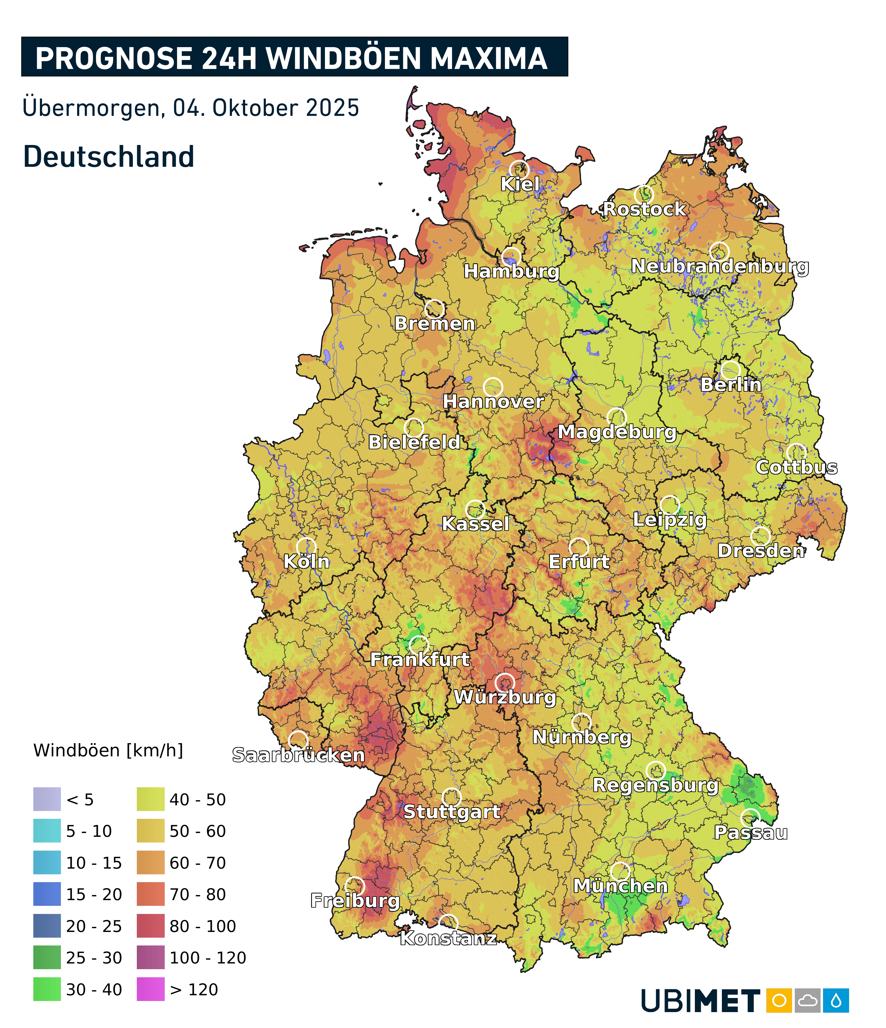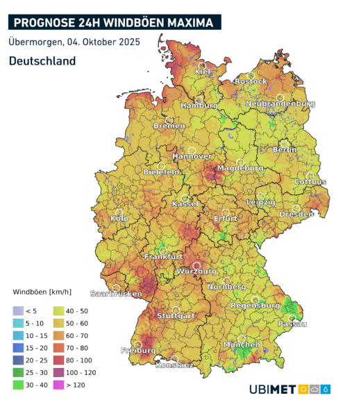 Da das Orkantief relativ weit weg von Deutschland zieht, halten sich die Auswirkungen im Rahmen. An der Küste sowie in den Hochlagen der Mittelgebirge werden vereinzelt Böen um die 100 km/h erwartet, ansonsten treten verbreitet Böen zwischen 60 und 80 km/h auf. Mit der Passage der Kaltfront am Samstag sind aber auch hier stellenweise stärkere Böen denkbar.