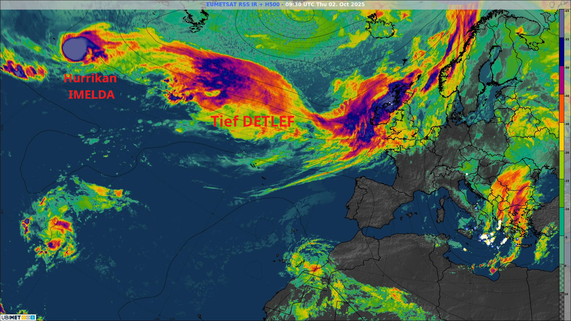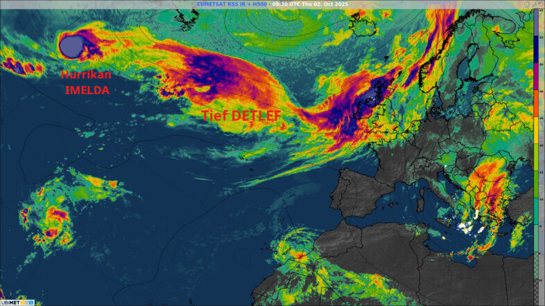 Der Hurrikan HUMBERTO hat sich gestern, bei der Annäherung an eine Frontalzone, die derzeit über dem Westatlantik liegt, aufgelöst. Davor hat sich ein kleines Tief namens DETLEF gebildet, welches sich momentan noch im sog. Wellenstadium befindet und allmählich nordostwärts zieht. Der Kerndruck beträgt derzeit etwa 995 hPa.