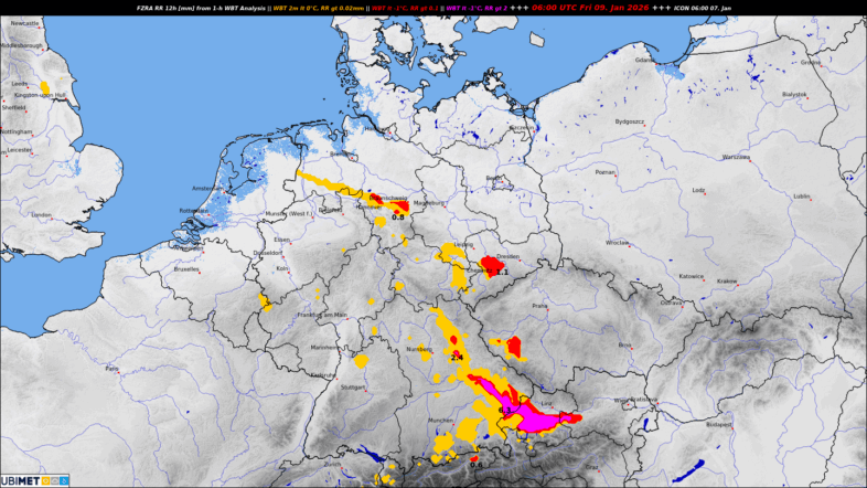Vor allem in Bayern, aber auch stellenweise in Baden-Württemberg und in den östlichen und nördlichen Mittelgebirgen zeichnen dabei am Freitag ein paar Millimeter gefrierender Regen ab. Hier besteht erhöhte Glättegefahr, besonders in Niederbayern.