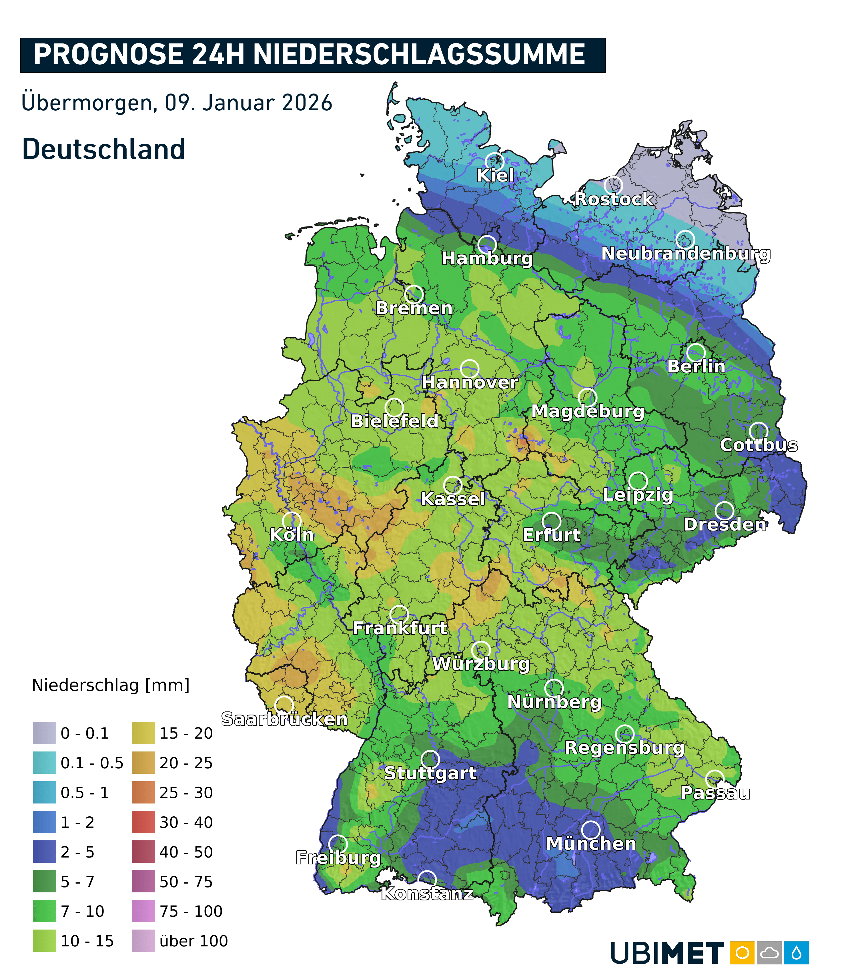 In der Phase der Milderung im Süden und Westen regnet es besonders im Westen des Landes zeitweise kräftiger, lokal kommen nach dem Schneefall um die 20 L/m² zusammen. Einige Modelle deuten an, dass mit der Kaltfront im Südwesten in der Nacht auf Freitag auch Gewitter aufkommen können.
