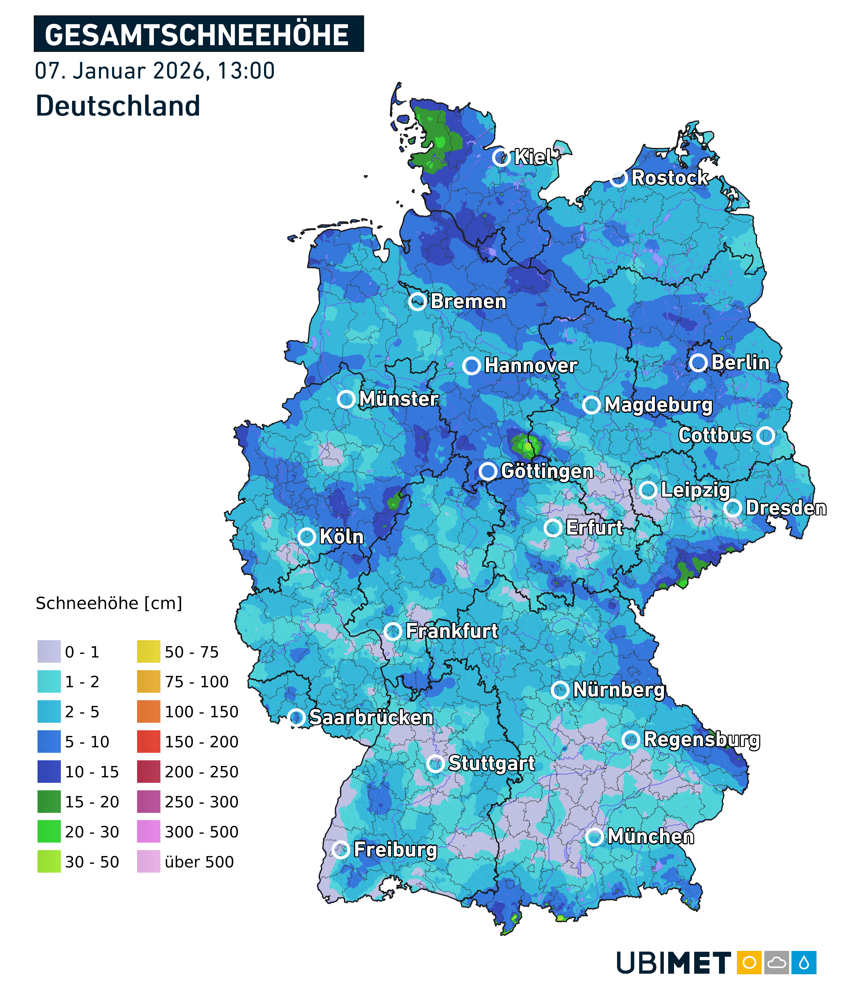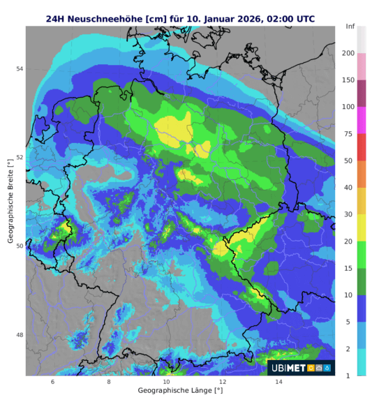 Besonders nördlich der Mittelgebirge sowie generell im Norden und Osten kann sich aber die kalte Luft halten und somit handelt es sich hier durchwegs um Schnee. Besonders in einem Streifen von Ostfriesland über die Heide und die Elbmündung bis in Richtung Fläming zeichnen sich am Freitag zwischen 10 und 20 cm Neuschnee ab. Aber auch zwischenzeitlich kommen bereits in der Nacht auf Freitag in den Mittelgebirgen 5 bis 10 cm Neuschnee zusammen.