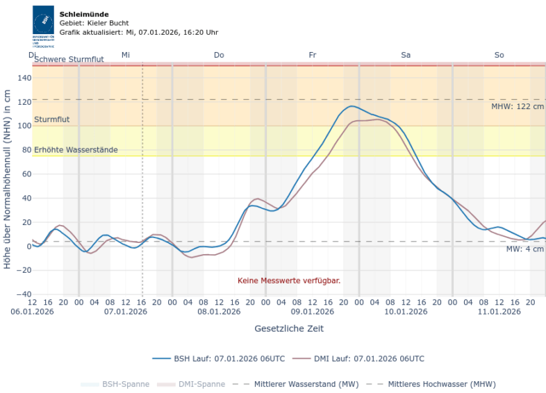 An der Ostseeküste weht stürmischer und eisiger Ostwind, auch hier sind Böen um 100 km/h zu erwarten. Diese sorgen für eine Sturmflut mit 1 bis 1,2 m über Normalnull. An der Nordsee wird hingegen eine Sturmebbe erwartet.