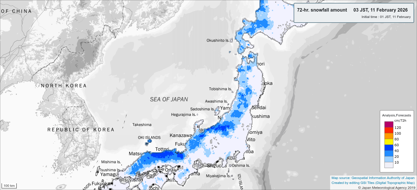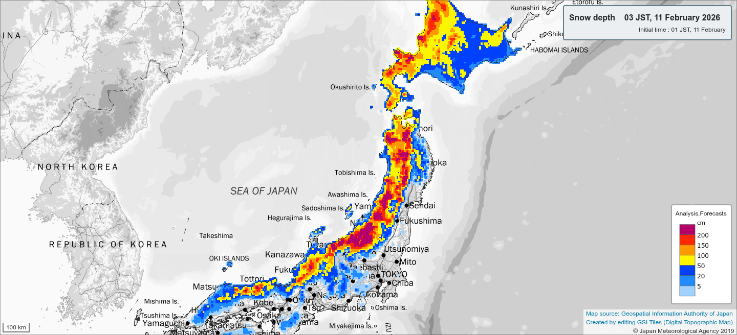Aktuelle Schneehöhen in cm für Japan @jma.go.jp vom 11.02.2026 03 IST Schneeprognose für Japan